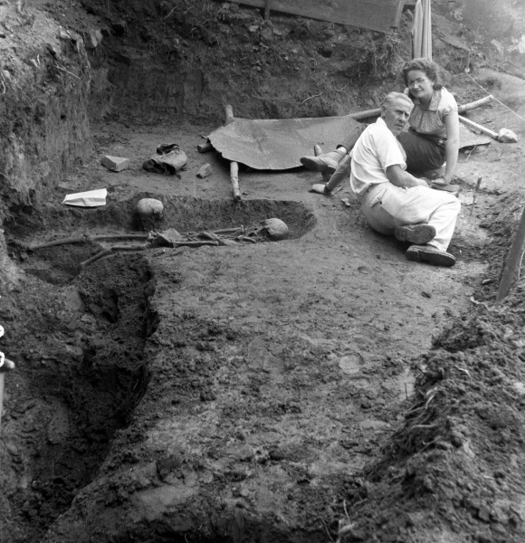 Holasovice, archeologický průzkum slovanského pohřebiště a kostela, výzkum hrobu č. 5, na snímku Zdeněk Martínek a Vlasta Šikulová, r. 1959.