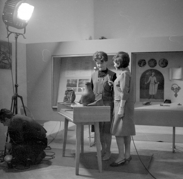 Vlasta Šikulová s reportérkou ČST, snímek z natáčení televizního pořadu „Blahopřání ke 150. narozeninám“ ve výstavní budově SZM, 21. 9. 1964.